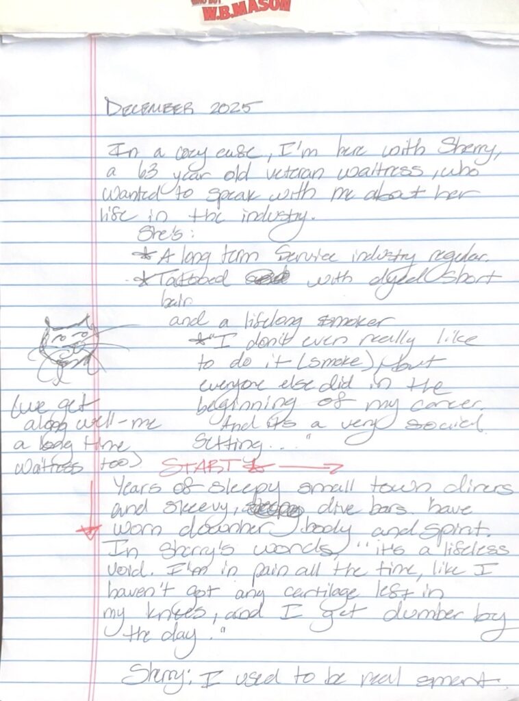 Grace: I’m here with Sherry, a 63-year-old veteran waitress, living in Vermont. I met her at a bar during a trip down to the city where she was on vacation with her husband. We chatted, and she wanted to speak with me for the magazine about her life in the industry, considering we’re both dutiful waitresses.